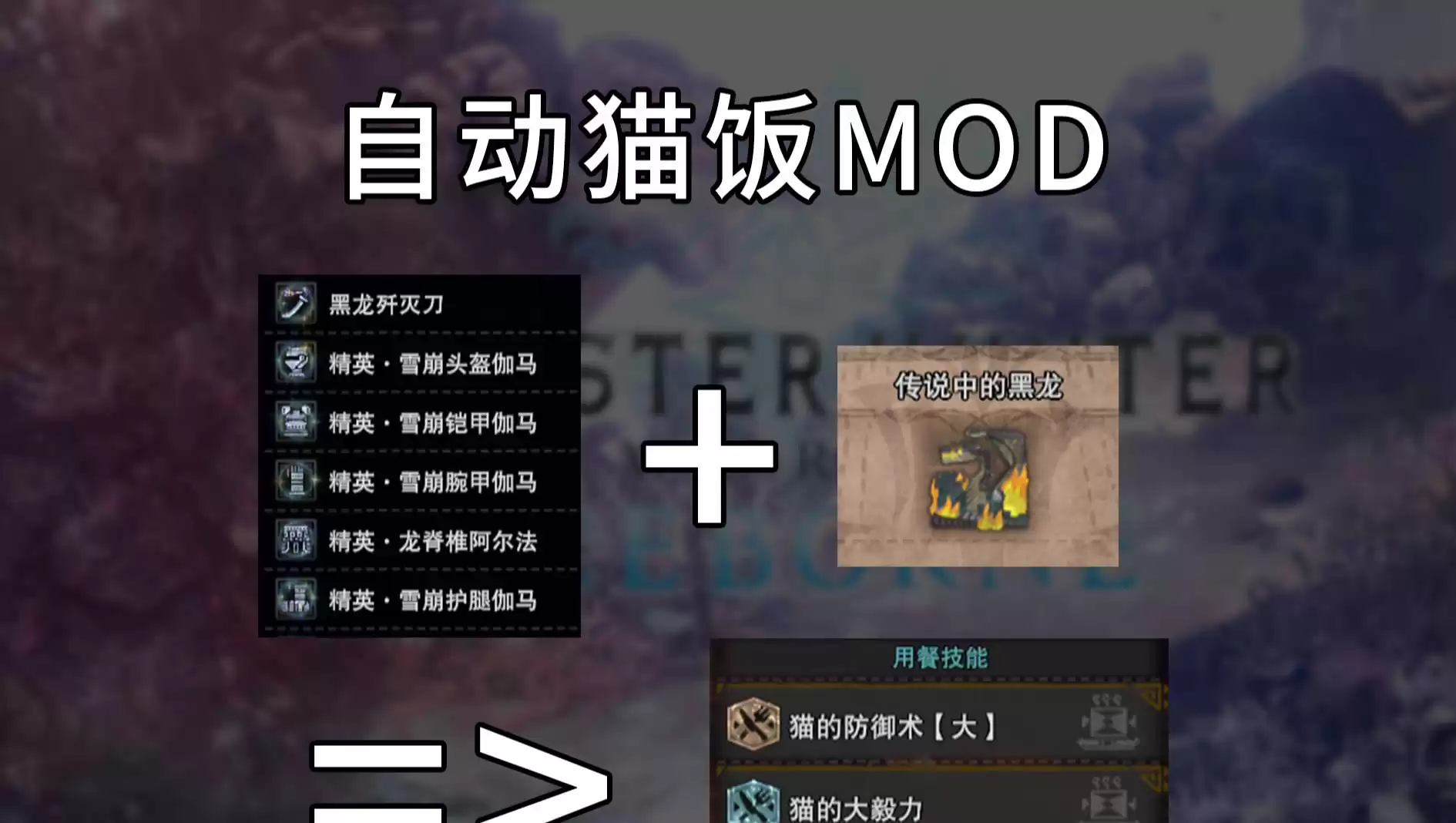 - 动态猫饭:根据用户保存的配置,对不同的武器+装备+任务,应用对应的的猫饭配置。例如,太刀使用猫的大毅力,双刀使用猫的体术。(需要用户自己设置)