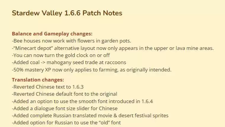 作者ConcernedApe宣布《星露谷物语》1.6.6版本现已上线PC平台,主要内容是错误修复和游戏优化,并把游戏的中文翻译恢复到了1.6.3版本。此前在1.6.4版本《星露谷物语》上线了新版中文翻译,但由于汉化组夹带私货和翻译质量等问题,新版中文翻译遭到了玩家社区的抵制,ConcernedApe随后发文道歉并承诺将中文翻译回滚。