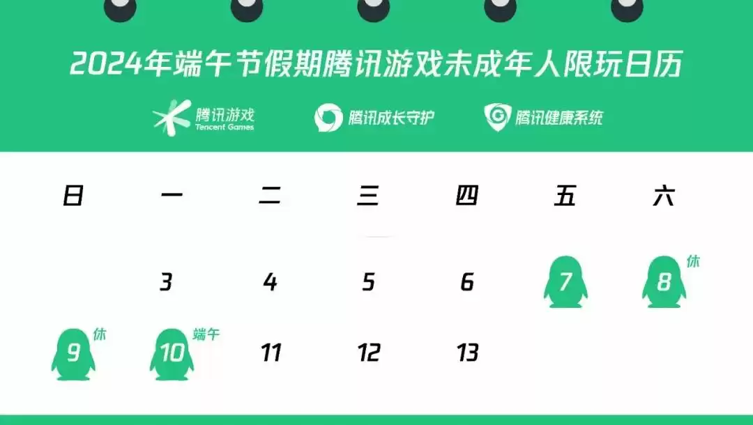 6月3日,结合国家新闻出版署《关于进一步严格管理 切实防止未成年人沉迷网络游戏的通知》与实际放假调休安排,腾讯游戏发布了2024年端午节未成年人限玩通知,端午节假期期间,对于腾讯游戏在中国大陆地区运营的网络游戏,未成年人可在6月7日至6月10日的20时至21时之间登录游戏,其余工作日为禁玩时段。