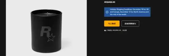而在R星的官方商店中,这样的香薰蜡烛一共有一黑一百两款,分别为“自由”和“罪恶”两款,均售价468港币,约合人民币425元一支。