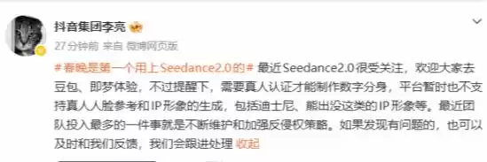 今日,抖音集团副总裁李亮发文称,最近Seedance 2.0很受关注,欢迎大家去豆包、即梦体验。