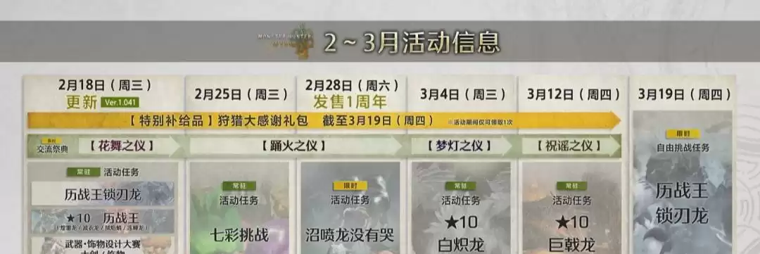 总的来说,《怪物猎人:荒野》即将迎来一个忙碌的三月,而卡普空也在持续推进游戏的后续扩展内容,以下是具体活动信息,让我们敬请期待吧。