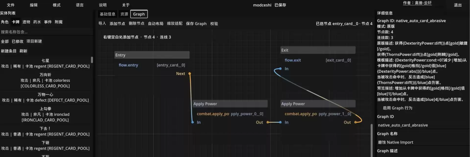对象类型可编辑内容角色基础字段编辑。角色当前没有 Graph 标签页。卡牌 / 遗物 / 药水基础字段、素材绑定、Graph 行为。事件基础字段、Graph 行为,适合做多页事件、奖励、战斗恢复页等。附魔基础字段、Graph 行为,可配合状态与钩子逻辑。