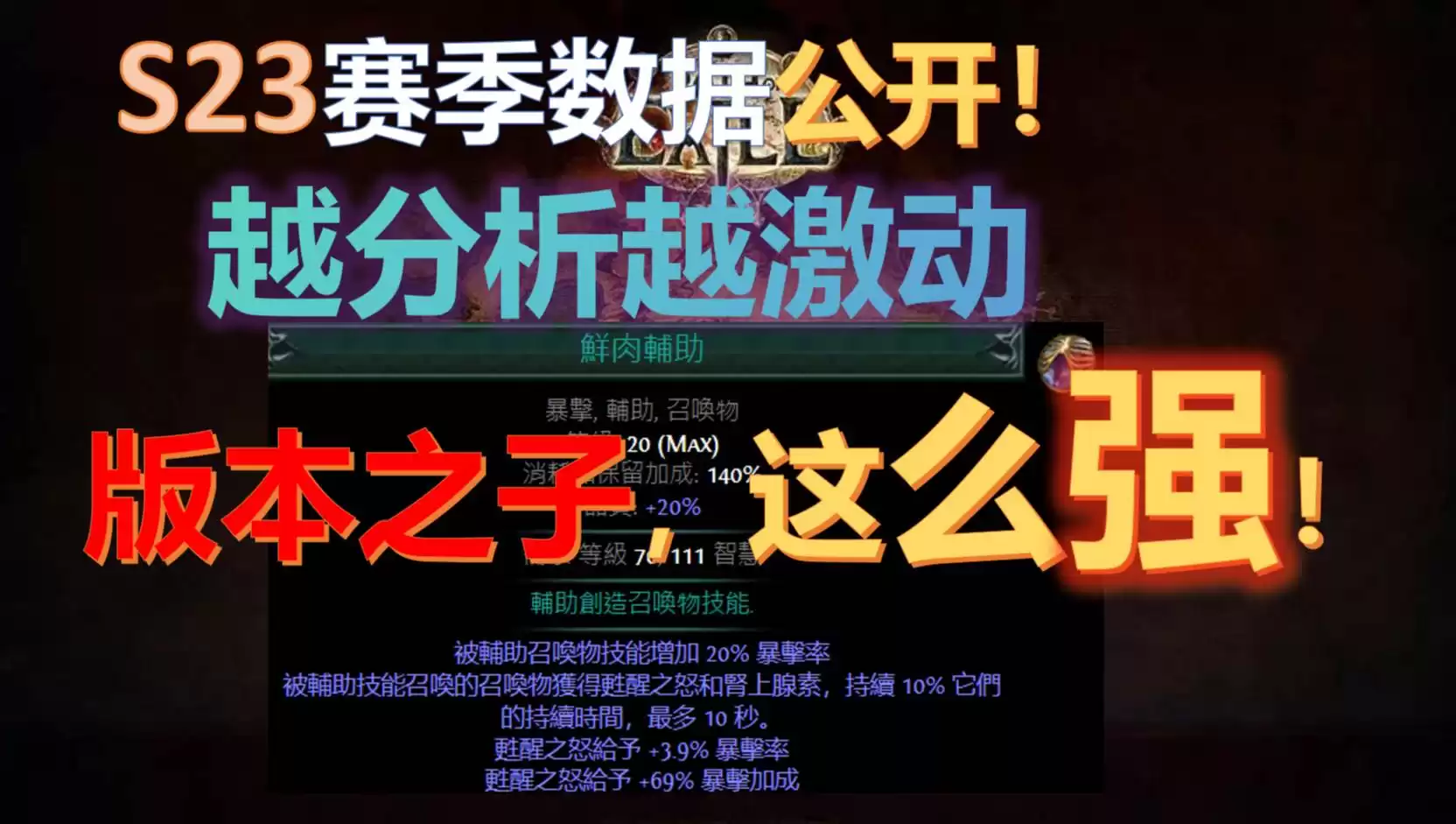 这个内容看完,点燃流下赛季肯定会是热门,围绕药剂持续时间的BD,一定会有很多花样,特别是目前的自伤重灾区,下赛季更容易轻松达成多药水情况不断,天赋纹身可以多+1智慧等级(应该会+1力量和+1敏捷的)、鲜肉辅助超模、返回辅助技能+穿透组合清图爽感拉满,是的,我说的是魔侍法师,其他的幻灵、火灵、蜘蛛、赦罪、幻化武器、纯净捷、霸气之击 虽然都可以适配,但是大部分和原来玩法类似,没有魔侍法师带来的提升那么大!