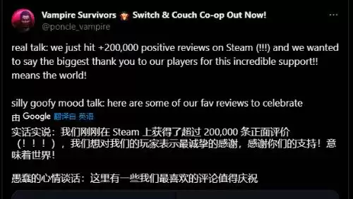 《吸血鬼幸存者》Steam好评数破20w:制作组感谢玩家