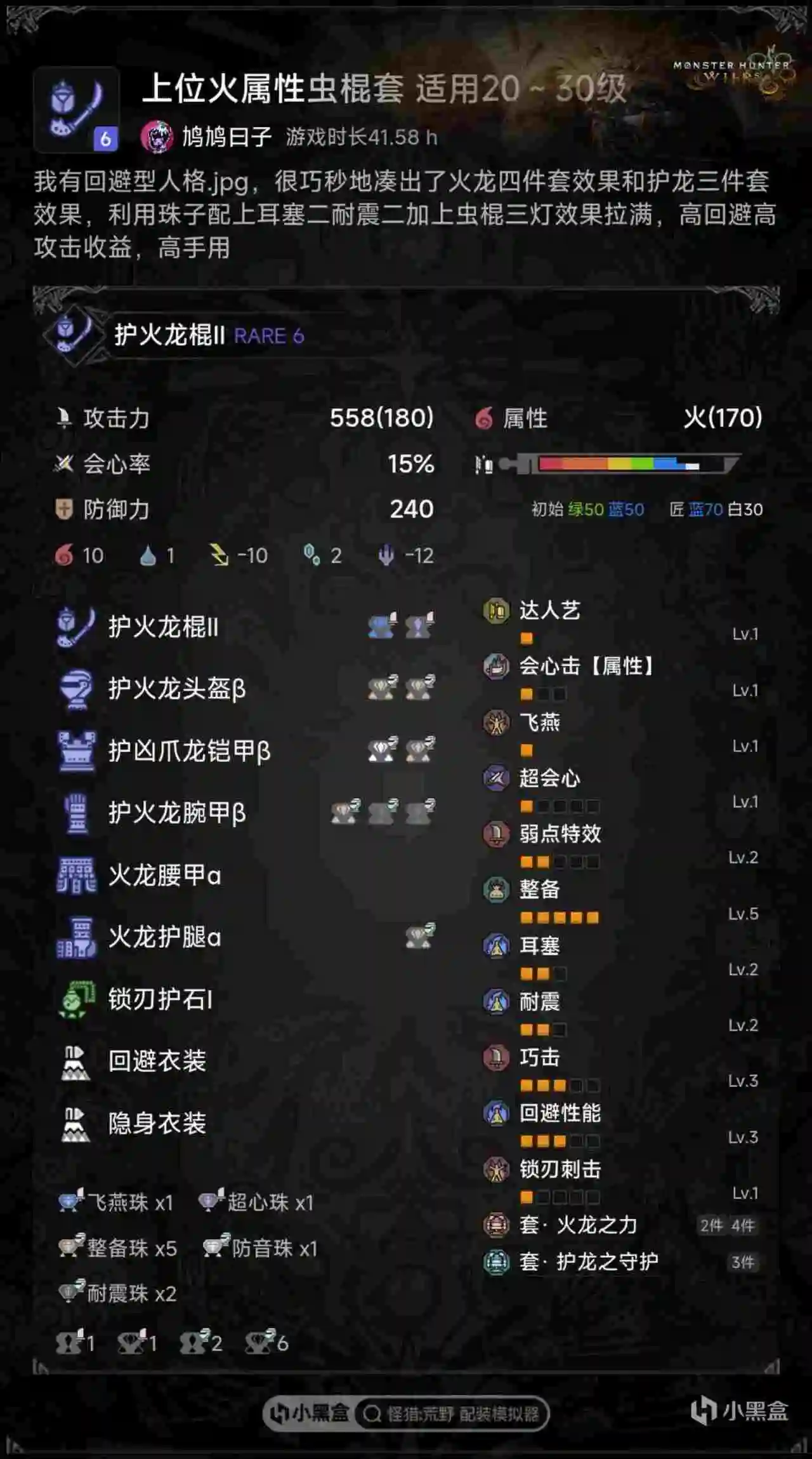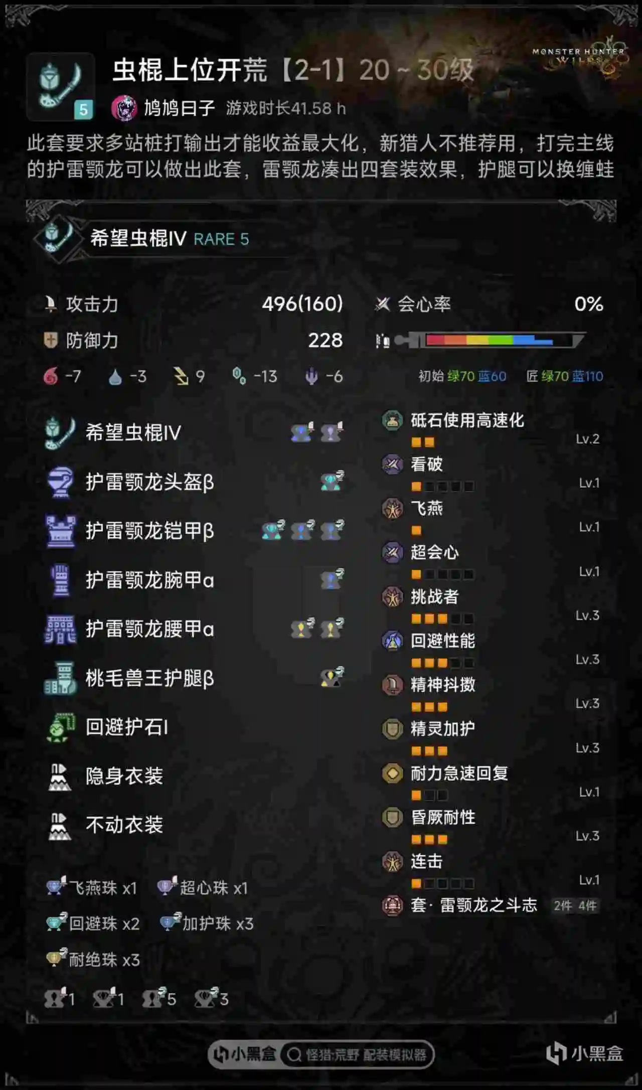 有很多其他很有趣的配装由于有明显的优缺点,就没有列在图里,并不代表不好,例如回避拉满的火龙套和打桩高会心的雷鄂龙套,操作拉满打相杀的辟兽套等等,这些属于侧重攻击而很吃操作的类型,一般来说有基础的老玩家更