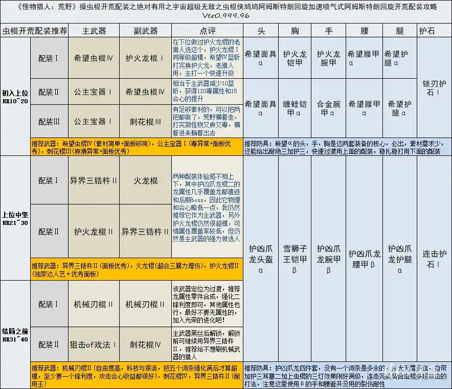 先贴出我做的一图流,用这张图基本能涵盖上位主线黑蚀龙前的所有武器和防具配装了,首先说明推荐不是必须,这张图的定位是帮助虫棍侠快速且舒适地度过主线,素材需求少,打怪体验好,属于是新老猎人皆宜。