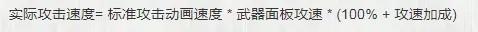 中文wiki原文:实际攻击速度= 标准攻击动画速度 * 武器面板攻速 * (100% + 攻速加成)。要注意也有一些增加攻速的方式不是算入上列公式的攻速加成内的,例如狂战士就是加成在总攻速上面的。