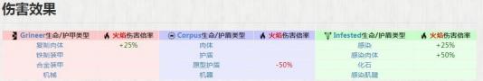 各种伤害类型对不同的护甲和生命类型有不同程度的伤害增益效果,如下图(火焰伤害),在计算护甲类型和生命类型增伤的时候,同一