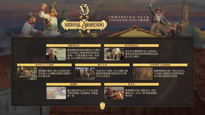 此扩展包包含了奥地利帝国,匈牙利的专属剧情内容,以及塞尔维亚,保加利亚,黑山,南斯拉夫与伊利里亚等国家,新增民族觉醒叙事事件,还有东方大